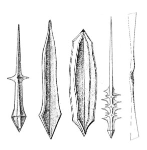 The acantharian skeleton, composed of strontium sulfate, consists of 10 diametral (or 20 radial), solid spicules which cross the cytoplasm. The distal ends of the spicules arise at precise points on the cell surface, which Müller (1859) described in an analogy to the surface of the earth (Fig. 2). This distribution of spicules is a general rule in the group, but differences in their degree of development (Fig. 3) are responsible for a vast variety of shapes. While in many species spicules are of equal length, in several families 2 or 4 equatorial spicules are larger and/or different in shape from the others, and either similar or different among themselves in size and shape. Differences can also be found between polar and tropical spicules, and can in turn lead to marked changes in the overall body shape: spherical, ovoid, lenticular, etc. The shape of the spicules is highly variable (Fig. 3), from simple cylindrical rods, to elaborate 4- or 6-bladed structures with smooth or serrated edges.