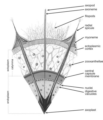 The cell consists of a central endoplasm and a peripheral ectoplasm, separated by a membrane - the central capsule. The endoplasm, which contains the nuclei, mitochondria, ribosomes, Golgi, endoplasmic reticulum, dictyosomes and various other organelles, is often brown, red, or black. The ectoplasm contains the digestive vacuoles. The cell is provided with axopodia, slender processes radiating from the cell surface which are sensitive and can retract upon chemical or physical stimulation. They are stiffened by a central axis (axoneme). The cytoplasm around each spicule contains 2-60 fibrillar myonemes anchored by one end to the spicule and by the other end to the periplasmic cortex (Fig. 4). The myonemes are motor organelles capable of active movement which govern the size of the cell and, probably, play a part in buoyancy regulation.