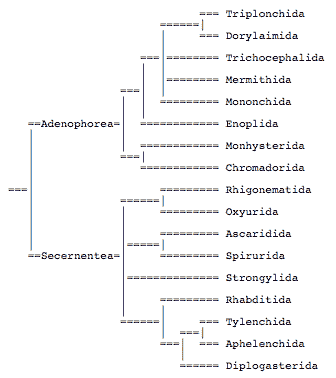 Litvaitis, M. K., J. W. Bates, W. D. Hope, and T. Moens. 2000. Inferring a classification of the Adenophorea (Nematoda) from nucleotide sequences of the D3 expansion segment (26/28S rDNA). Canadian Journal of Zoology 78:911-922.