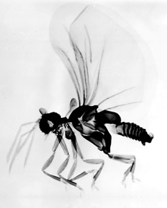 Strepsiptera are obligate parasites of insects, with hosts ranging across 7 orders and 34 families. The name of the group is derived from the Greek words for twisted (streptos) and wing (pteron) and refers to the peculiar twisted wing of the male's hind-wings while in flight. Representatives of the suborder Mengenillidia generally show more primitive characteristics (fig. 1). The Mengenillidae parasitize Thysanura (Lepismatidae), the only known order in the sub-class Apterygota to be attacked by strepsipterans, while Mengeidae are known only from fossil males from Baltic amber. We have very little information about their life history, therefore.